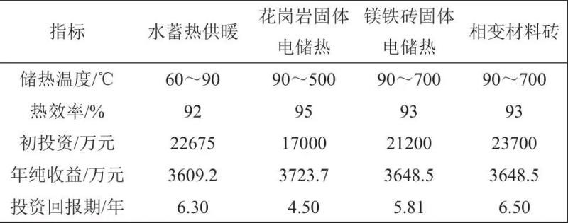 國外對高溫固體電儲熱技術的研究始于20世紀70年代,到80年代初,歐洲部分發(fā)達國家已開始進行實際應用。Sorour對高溫固體電儲熱器進行了優(yōu)化設計,發(fā)現(xiàn)蓄熱材料大小、高度、換熱流體流量以及輸入熱量是影響蓄熱性能的主要參數(shù)。Laing等開發(fā)了高溫混凝土蓄熱示范模塊,驗證了模塊在500 ℃的穩(wěn)定性以及200~500 ℃環(huán)境中長期儲熱的損耗。我國在高溫固體電儲熱技術應用已達到國際領先水平,但是目前研究多為應用形式的設計和經(jīng)濟性的分析,對于技術涉及的傳熱傳質(zhì)過程等基礎研究缺乏深入的探討。劉曉東設計了一種固體電儲熱供暖裝置,利用氧化鎂磚和熱管組成封閉的儲熱單元,降低氧化鎂磚固體的氧化速度。朱建新提出了一種帶預制固體熱能存儲裝置的供熱系統(tǒng),利用金屬傘裙把固體儲熱材料分段,減小大范圍開裂損壞的危險。葛維春等對固體電制熱儲熱供暖機組,利用室內(nèi)溫度需求、建筑物耗熱量、建筑物熱指標、采暖季熱負荷、儲熱機組加熱功率與蓄熱量等5個指標提出一種經(jīng)濟性配置方法。苗常海等通過臨界電價法分析水儲熱、高溫固體儲熱、市政供暖技術、相變電儲熱技術的經(jīng)濟性,發(fā)現(xiàn)水儲熱、高溫固體儲熱技術相比市政供暖更具經(jīng)濟可行性,且前者的經(jīng)濟性最好。曲弘等驗證了高溫固體電儲熱供暖技術對于實行峰谷電價地區(qū)的非居民項目具有顯著的經(jīng)濟效益。陳彬等分析了高溫固體電儲熱供暖技術不僅具有一定的經(jīng)濟效益,更可產(chǎn)生環(huán)境效益,增大低谷段的風電和核電等清潔能源消納能力。表6為北京某供暖面積200萬m2電蓄熱方案經(jīng)濟性對比,從表中可以看出高溫固體電儲熱技術的經(jīng)濟性優(yōu)于水儲熱技術,且采用花崗巖為固體儲熱介質(zhì)的經(jīng)濟性明顯好于以鎂鐵磚為固體儲熱介質(zhì)。