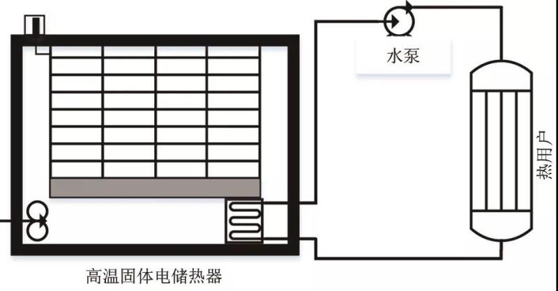 高溫固體電儲熱技術是在谷值電價時利用電加熱設備直接將電能轉(zhuǎn)化為熱能,并儲存于固體儲熱器;在峰值電價時與供暖系統(tǒng)熱水進行換熱,進而為建筑供暖的技術,其技術原理圖見圖6。高溫固體具有儲熱密度大、儲熱溫度高、儲熱體積小等優(yōu)點,不但克服液體儲熱技術的缺點,而且兼具環(huán)保、高效、節(jié)能、安全等多項優(yōu)勢。