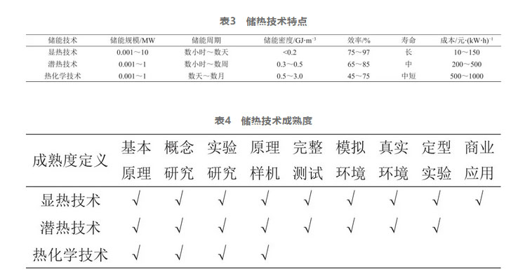 (2)儲熱技術可分為顯熱儲熱技術、潛熱儲熱技術和熱化學儲熱技術。顯熱儲熱技術具有儲熱規(guī)模大、壽命長、成本低、技術成熟度高等優(yōu)點,是研究最早、利用最廣泛、最成熟的技術;潛熱儲熱技術具有儲熱密度高、放熱過程溫度近乎恒定的優(yōu)點,是目前主要研究和應用熱點;熱化學儲熱技術具有更大的能量儲存密度可實現(xiàn)長期儲存熱能等優(yōu)點,但處于實驗室驗證階段。
