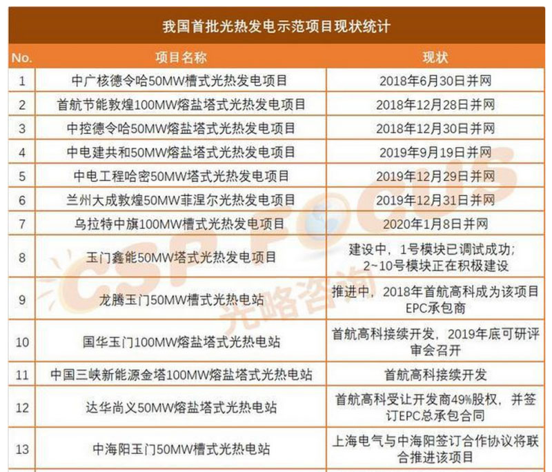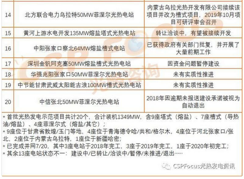 時至今日已有三年半的時間,20座示范項目的進展情況也一直備受全球光熱行業(yè)人士的關(guān)注。由此,整理了如下現(xiàn)狀統(tǒng)計情況供光熱人士參考: