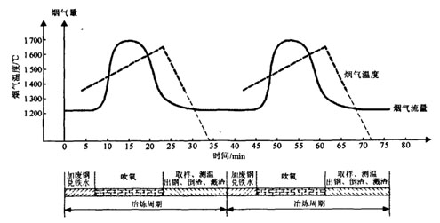 鋼鐵企業(yè)的轉(zhuǎn)爐煉鋼工藝是產(chǎn)生間歇性余熱的主要環(huán)節(jié),在一個冶煉周期內(nèi),分為裝料、吹煉和出鋼三個步驟,把裝入的鐵水經(jīng)過吹氧,完成降碳、升溫、脫磷等高溫物理化學(xué)反應(yīng),最后排出大量的CO、CO2等高溫廢氣,這種工藝決定了轉(zhuǎn)爐高溫?zé)煔饩哂虚g歇性,波動性和周期性[1,2],如下圖1所示