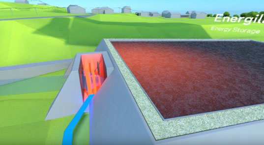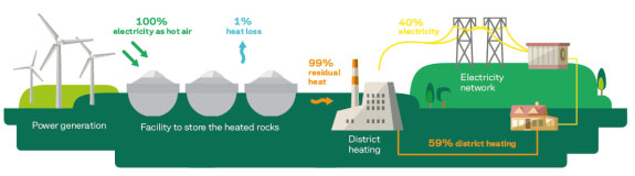 其熱儲(chǔ)能設(shè)施由一堆絕熱的石頭組成,加熱到600℃,由風(fēng)力渦輪機(jī)的剩余電力提供能量。在一段時(shí)間之后,當(dāng)再次需要能量時(shí),將其熱量通過水蒸氣驅(qū)動(dòng)發(fā)電機(jī)產(chǎn)生電力,余熱供給區(qū)域供熱。