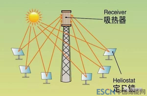 塔式太陽(yáng)能光熱發(fā)電是指利用大規(guī)模陣列拋物或碟形鏡面反射太陽(yáng)光到集熱塔頂端的集熱器,集熱器中的熱量通過(guò)換熱裝置加熱鍋爐產(chǎn)生蒸汽,驅(qū)動(dòng)汽輪機(jī)帶動(dòng)發(fā)電機(jī)組發(fā)電。