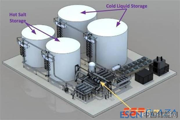 其中兩個(gè)罐裝滿鹽,兩個(gè)裝滿防凍劑。該系統(tǒng)取電并將其轉(zhuǎn)變?yōu)閱为?dú)的冷熱空氣流。熱空氣加熱鹽,而冷空氣冷卻防凍劑。使整個(gè)事情發(fā)揮作用的秘訣在于這個(gè)過(guò)程是可逆的。當(dāng)這種情況發(fā)生時(shí),熱空氣和冷空氣一起沖擊,形成一個(gè)高速的洪流,旋轉(zhuǎn)渦輪機(jī)來(lái)產(chǎn)生電力。
