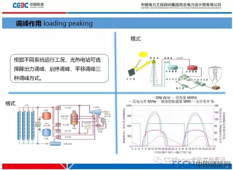 這張圖有很多嘉賓都在分享,這是我們根據(jù)DNI值模擬出來的一個塔式熔鹽的出力特性,包括儲熱量和光學效率等,可以看到黑虛線是儲罐的儲熱容量,其實在沒有儲滿的時候完全可以進行調(diào)峰,儲滿以后進行調(diào)峰可能就棄光了,這是今天下午一直在說的問題。光熱電站可以根據(jù)不同的系統(tǒng)運行情況,可以進行降出力調(diào)峰,這是沒有任何問題的,同時啟停調(diào)峰成本比較低,僅僅消耗一些電量,有一些天然氣的氣量,同時還可以進行平移調(diào)峰,削峰填谷,光伏大發(fā)的時候儲起來,這樣進行一個平移調(diào)峰。
