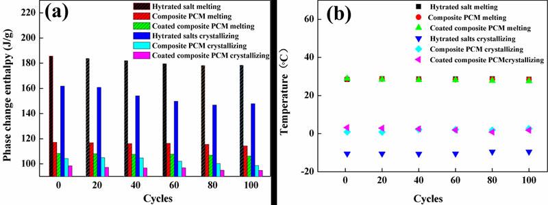 六水氯化鈣、復合材料和包覆的復合材料在循環(huán)中焓值變化 (a)相變焓值 (b)相變溫度