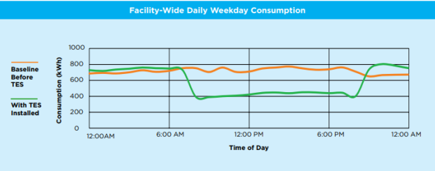 Dreisbach Enterprises公司冷凍食品配送中心在采用這種技術(shù)之后,工作日能源消耗下降了20%,M&V公司報告稱,為了給熱儲能設(shè)施充電,其非高峰期間的能耗增加了5%。