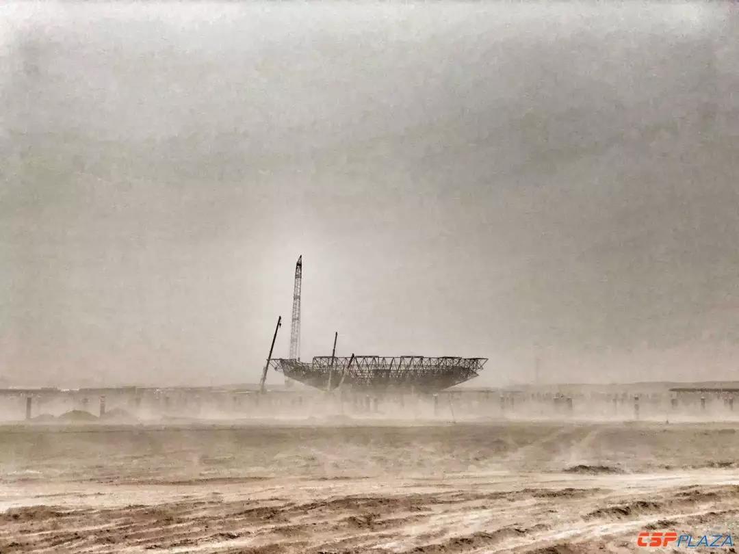中國儲能網訊:這不是科幻電影,這是在建的玉門鑫能50MW二次反射熔鹽塔式電站的建設場景(下圖),當天,沙塵暴侵襲了該項目地。
