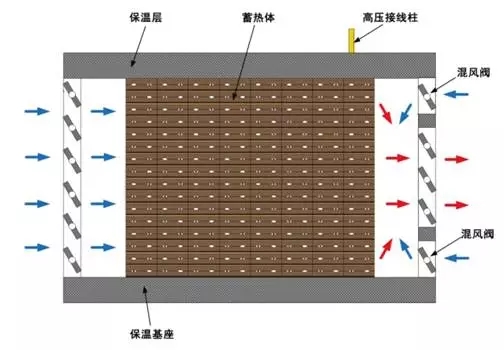(2)固體儲(chǔ)熱一般采用金屬氧化物作為儲(chǔ)熱介質(zhì),如高密度鐵鎂金屬氧化物材料,儲(chǔ)熱溫度最高可達(dá)800℃,利用空氣作為換熱介質(zhì),由變頻風(fēng)扇驅(qū)動(dòng)空氣進(jìn)行熱量循環(huán)和交換,固體儲(chǔ)熱示意圖如圖3所示。固體儲(chǔ)熱溫度高,儲(chǔ)能密度較大,對(duì)外輸出熱能的形式多樣,既可以提供最高溫度400℃的熱風(fēng),也能夠提供300℃以下的熱油,還可以提供高溫蒸汽和熱水,因此能夠滿足工業(yè)和民用多個(gè)領(lǐng)域的用熱需求。