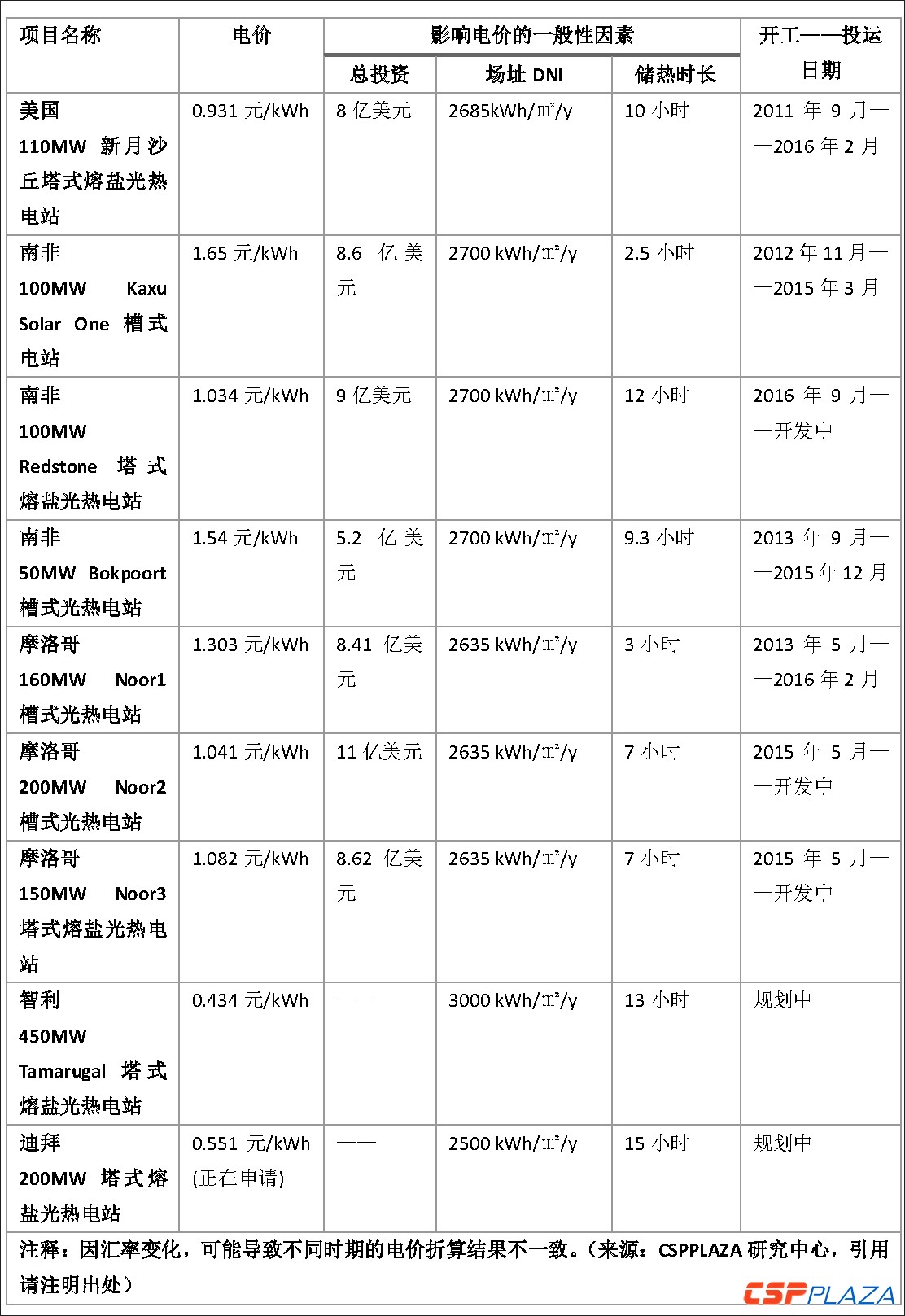 總體來(lái)看,如果不考慮優(yōu)惠政策支持等特殊影響因素,除去2017年剛剛開(kāi)始規(guī)劃的智利和迪拜項(xiàng)目,在南非和摩洛哥這類(lèi)輻照資源很好的地區(qū)開(kāi)發(fā)光熱電站,其最低電價(jià)水平約1.03元/kWh(按當(dāng)前匯率折算)。