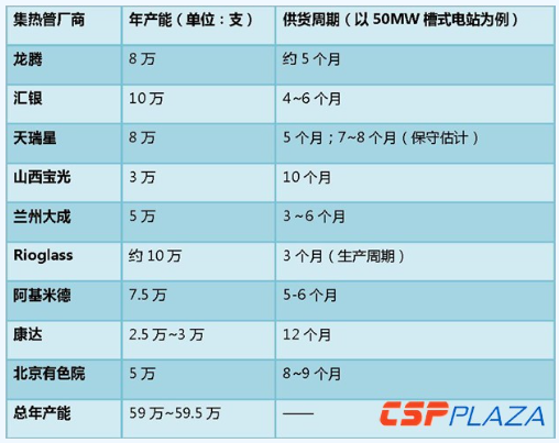 一裝機(jī)規(guī)模為50MWe的儲能型槽式/菲涅爾式光熱電站,總集熱管需求量約25000~30000支。粗略核算,首批示范項目建設(shè)對集熱管的總需求量預(yù)計為31萬~37萬支(除去已完成集熱管采購的中廣核項目)。面對如此大量的市場需求以及大規(guī)模的集中性采購熱潮,上述幾大廠商的產(chǎn)能是否能夠滿足示范項目的總體需求呢?