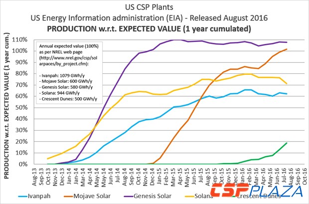 單純地從實(shí)際發(fā)電量與設(shè)計(jì)發(fā)電量的對(duì)比來(lái)看,槽式無(wú)儲(chǔ)熱電站的表現(xiàn)最佳,Genesis Solar在2015年全年的發(fā)電量達(dá)到621454MWh,達(dá)設(shè)計(jì)年發(fā)電量的107%;Solana電站在2015年全年的發(fā)電量達(dá)到718843MWh,達(dá)設(shè)計(jì)年發(fā)電量的76%;Ivanpah電站2015年度總發(fā)電量達(dá)到670467MWh,達(dá)設(shè)計(jì)年發(fā)電量的62%。這三大電站的投運(yùn)時(shí)間相近,排除各自需要的學(xué)習(xí)過(guò)渡期的因素影響,槽式無(wú)儲(chǔ)熱電站看起來(lái)更易達(dá)到設(shè)計(jì)發(fā)電目標(biāo)。