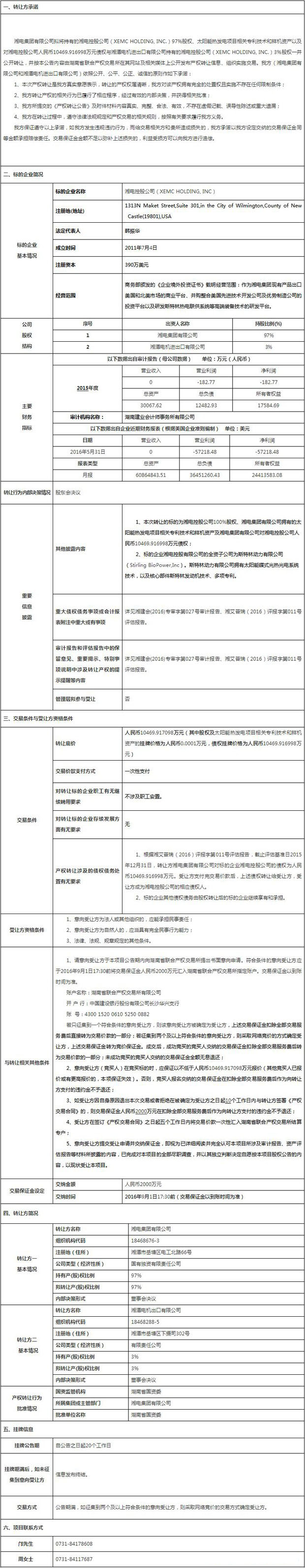 此次轉(zhuǎn)讓的標(biāo)的企業(yè)為湘電控股有限公司(XEMC HOLDING,INC),于2011年4月在美國(guó)特拉華州注冊(cè)成立,其定位是湘電集團(tuán)現(xiàn)有產(chǎn)品出口美國(guó)和北美市場(chǎng)的商業(yè)平臺(tái)、并購(gòu)整合美國(guó)先進(jìn)技術(shù)開(kāi)發(fā)公司及優(yōu)勢(shì)制造公司的投資平臺(tái)以及研發(fā)斯特林熱電聯(lián)供系統(tǒng)等高端裝備技術(shù)的研發(fā)平臺(tái)。此次將一并轉(zhuǎn)讓的資產(chǎn)包括:湘電集團(tuán)有限公司擁有的湘電控股公司的97%股權(quán)、太陽(yáng)能熱發(fā)電項(xiàng)目相關(guān)專利技術(shù)和樣機(jī)資產(chǎn)、對(duì)湘電控股公司人民幣10469.916998萬(wàn)元債權(quán)以及與湘潭電機(jī)進(jìn)出口有限公司持有的湘電控股公司(XEMC HOLDING,INC.)3%股權(quán)。
