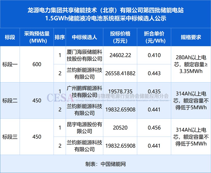 本次采購預(yù)估量1.5GWh,海辰儲能、鵬輝能源、昆宇電源、蘭鈞新能源這四家企業(yè)入圍,投標(biāo)報(bào)價(jià)在0.41-0.456元/Wh區(qū)間內(nèi),其中海辰儲能、鵬輝能源、昆宇電源分別以0.41元/Wh、0.435元/Wh、0.456元/Wh的單價(jià)預(yù)中標(biāo)。