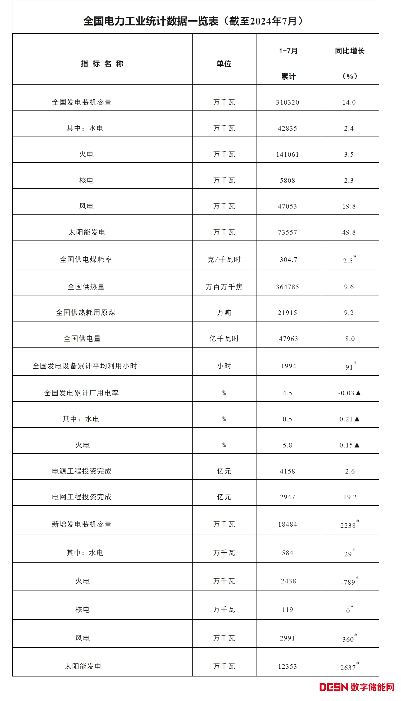 注:1.全國發(fā)電裝機(jī)容量及其中的分項(xiàng)指截至統(tǒng)計(jì)月的累計(jì)裝機(jī)容量。 2.全國供電量為調(diào)度口徑數(shù)據(jù)。 3.“同比增長”列中,標(biāo)*的指標(biāo)為絕對量;標(biāo)▲的指標(biāo)為百分點(diǎn)。