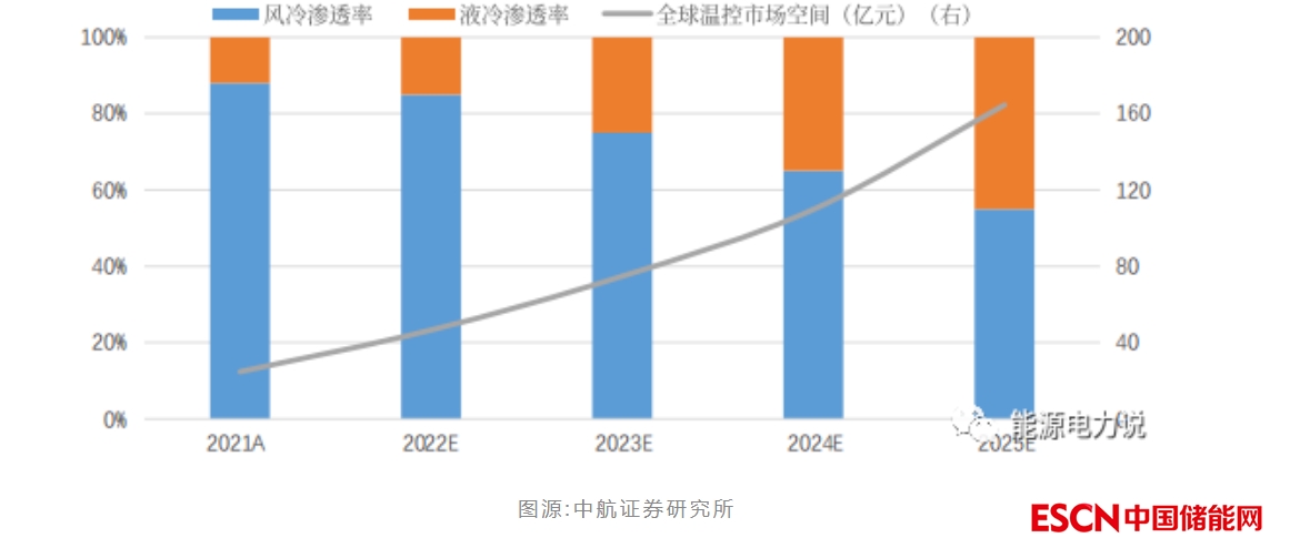 儲能溫控市場處于早期階段,均以跨界玩家為主,標(biāo)準(zhǔn)不統(tǒng)一、集中度較低。儲能溫控價值量占總量的3%~5%,其中風(fēng)冷、液冷憑借性價比優(yōu)勢率先產(chǎn)業(yè)化。目前市場以風(fēng)冷為主,液冷成本較高,但在均勻性、體積和能耗方面的優(yōu)勢明顯,滲透率有望由21年的12%提升至2025年45%。液冷/風(fēng)冷溫控系統(tǒng)成本別約為0.9/0.3億元/GWh,預(yù)計至2025年,市場空間有望達到160億元。