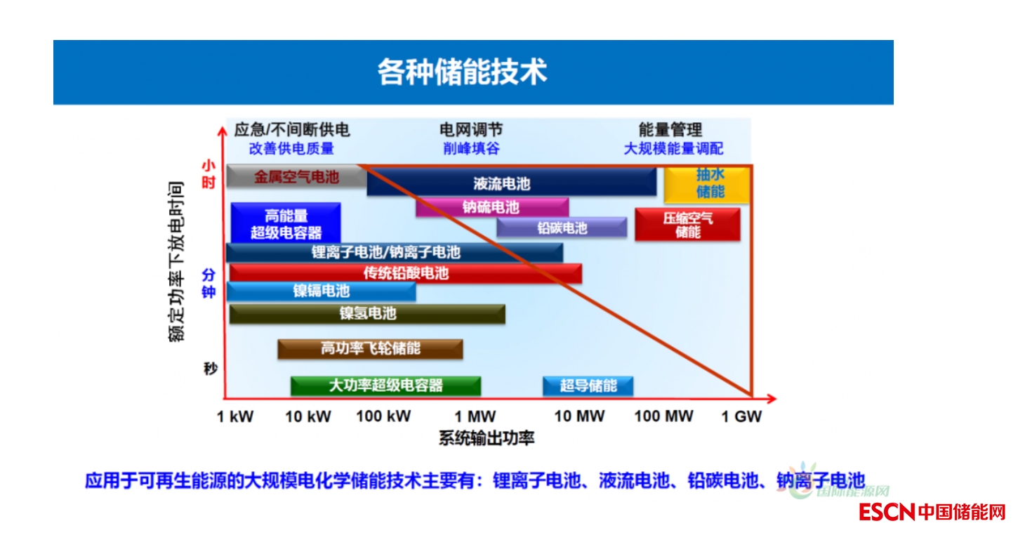 這張圖大家想必不會陌生,很多人都引用過。其中,橫坐標代表不同儲能技術(shù)系統(tǒng)輸出功率,越往右就是系統(tǒng)功率越大,縱坐標是放電時長,越往上越適合長時儲能,因此未來可以做成大規(guī)模儲能的種子選手,也就是右上角的這幾個。