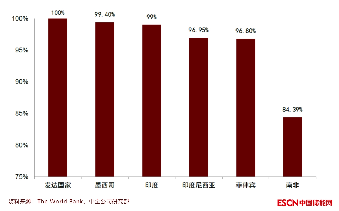 其他發(fā)展中國家風(fēng)光裝機增長及電網(wǎng)基礎(chǔ)設(shè)施薄弱驅(qū)動儲能裝機需求。2021年以來,巴西、印度、智利等國家均通過政策手段驅(qū)動表前及表后儲能裝機。此外,如南非等部分發(fā)展中國家電力基礎(chǔ)設(shè)施相對薄弱、電網(wǎng)覆蓋率低、停電次數(shù)多,將帶來部分保障供電系統(tǒng)穩(wěn)定性與離網(wǎng)式儲能需求。