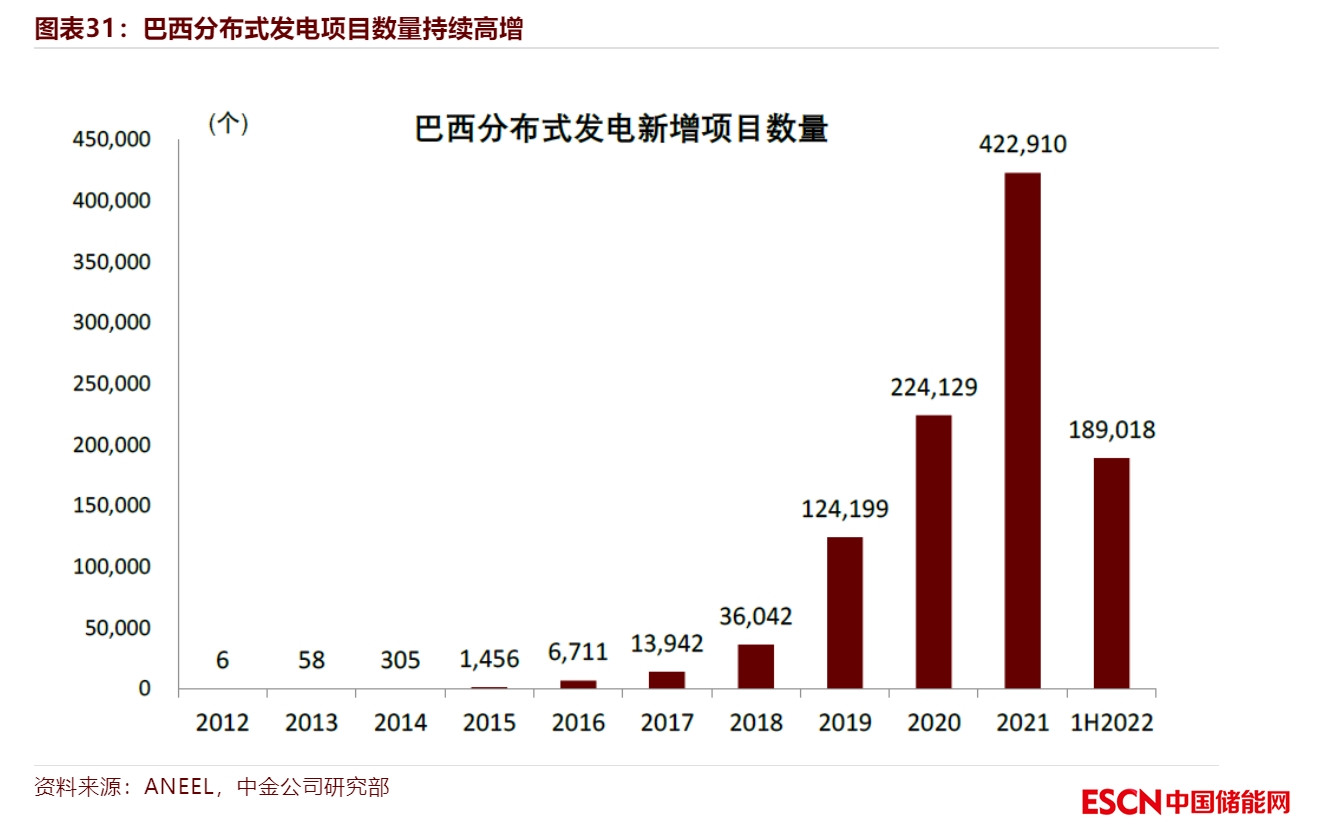 以巴西為例,過去十年間政策驅(qū)動分布式光伏裝機高增,電網(wǎng)基礎(chǔ)設(shè)施薄弱逐步成制約因素。在持續(xù)的“凈計量”政策刺激之下,巴西分布式光伏項目數(shù)量持續(xù)高增,2021年新增項目數(shù)量已突破42萬個。而另一方面,持續(xù)增長的風(fēng)光裝機對巴西原本并不發(fā)達(dá)的電力系統(tǒng)帶來巨大挑戰(zhàn),政府需通過改善電網(wǎng)基礎(chǔ)設(shè)施或增強靈活性資源等方式適應(yīng)波動性可再生能源的大規(guī)模接入問題。