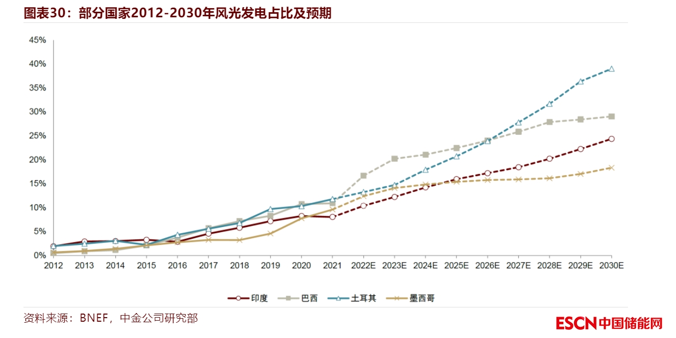 巴西、菲律賓、泰國等發(fā)展中國家通過目標(biāo)規(guī)劃、補貼政策等方式驅(qū)動風(fēng)光裝機。預(yù)期眾多發(fā)展中國家風(fēng)光裝機及發(fā)電量占比快速提升。2021年巴西、土耳其、墨西哥和印度風(fēng)光發(fā)電量分別占總發(fā)電量的10.91%、11.78%、9.62%和8.04%,BNEF預(yù)期在2030年,其風(fēng)光發(fā)電量占比將分別提升至29.05%、39.02%、18.33%和24.36%。