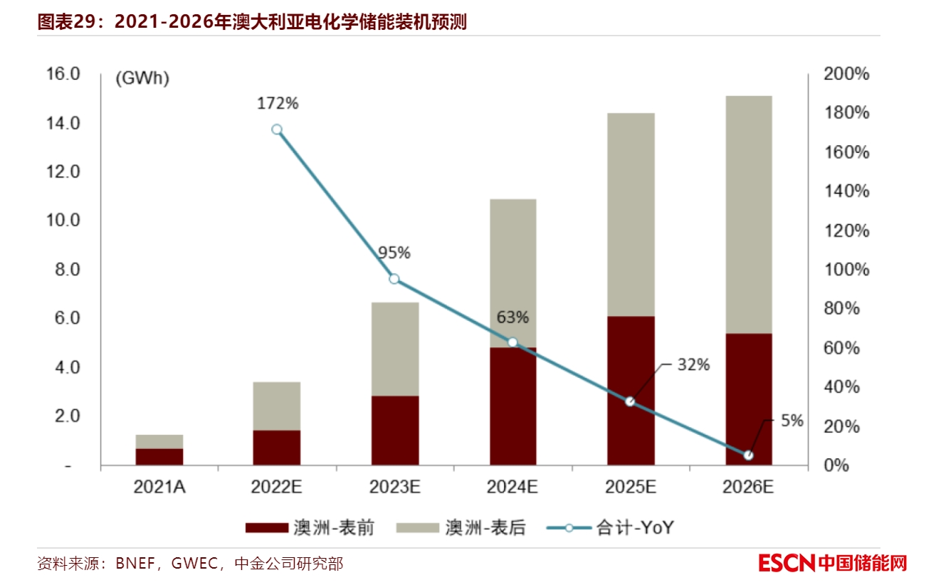短期看,我們預(yù)計2023年澳大利亞電力系統(tǒng)中新增電化學(xué)儲能裝機達(dá)7GWh,其中表前/表后市場分別為3/4GWh。展望未來,我們認(rèn)為澳大利亞市場分布式光伏裝機規(guī)模較大、FiT退坡后持續(xù)驅(qū)動表后儲能裝機,表前市場主要受益于東南部電網(wǎng)靈活性資源缺乏,預(yù)計2026年澳大利亞新增電化學(xué)儲能裝機15GWh,其中表前/表后分別為5/10GWh。
