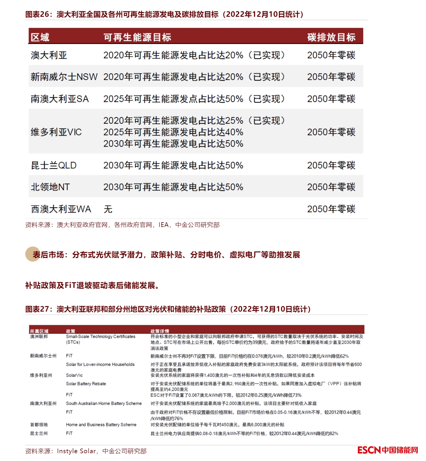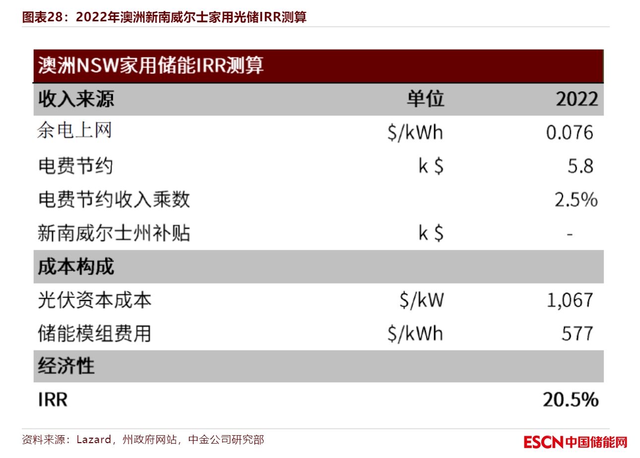 我們認(rèn)為短期看,澳大利亞市場東南部電網(wǎng)靈活性資源需求提升、表前儲能或?qū)⑵鹆浚砗笫袌瞿习?、新南威爾士光儲系統(tǒng)經(jīng)濟(jì)性較好;中長期看,澳大利亞可再生能源發(fā)電目標(biāo)明確,電化學(xué)儲能有望成為表前裝機主力,表后市場分布式光伏發(fā)展賦能配儲空間,主要關(guān)注FiT退坡和各地部分補貼政策的變化。