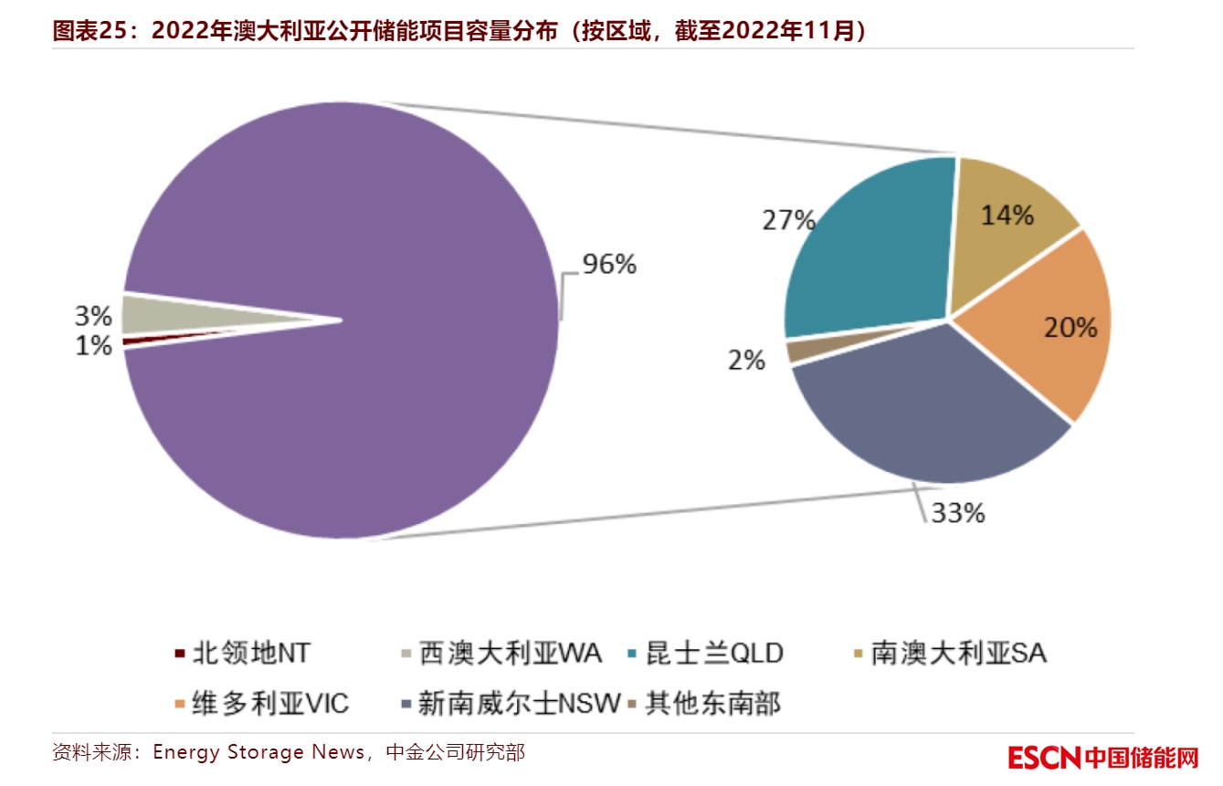 表前大儲或?qū)⑵鹆浚瑬|南部電網(wǎng)有望成為裝機主力。根據(jù)我們統(tǒng)計,2022年以來澳大利亞市場公開電化學(xué)儲能項目儲備規(guī)模達(dá)10.7GW/25.4GWh,其中東南部電網(wǎng)規(guī)劃裝機容量超過96%,主要分布在新南威爾士州、昆士蘭州、維多利亞州。