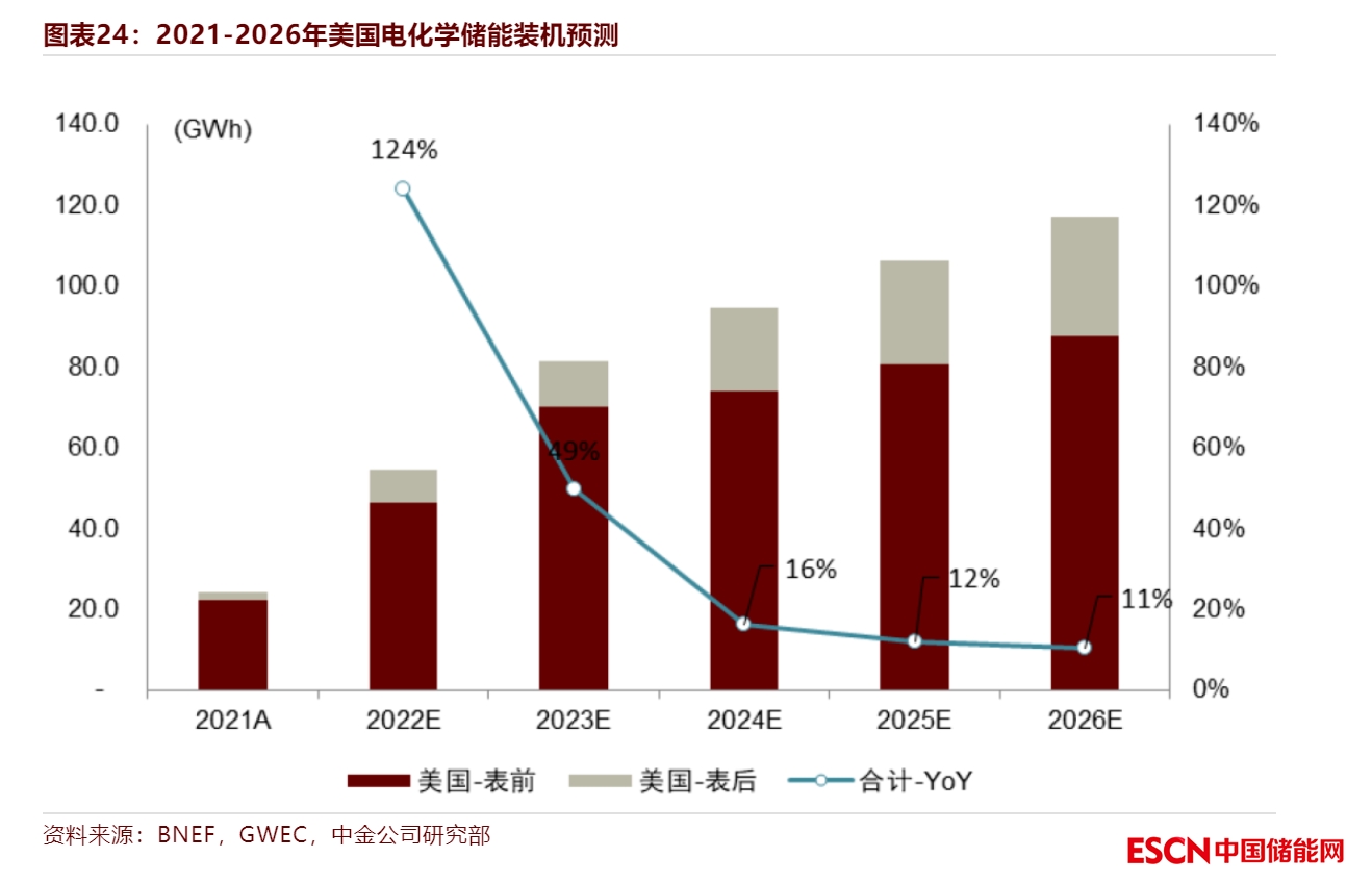 短期看,我們預(yù)計2023年美國電力系統(tǒng)中新增電化學(xué)儲能裝機達(dá)81GWh,其中表前/表后市場分別為70/11GWh。展望未來,我們認(rèn)為美國加州、德州等表前市場對靈活性資源需求較高,表前大儲裝機有望維持較大規(guī)模,表后儲能有望隨光伏余電上網(wǎng)電價政策的改變而翻倍增長,預(yù)計2026年美國新增電化學(xué)儲能裝機117GWh,其中表前/表后分別為87/30GWh。