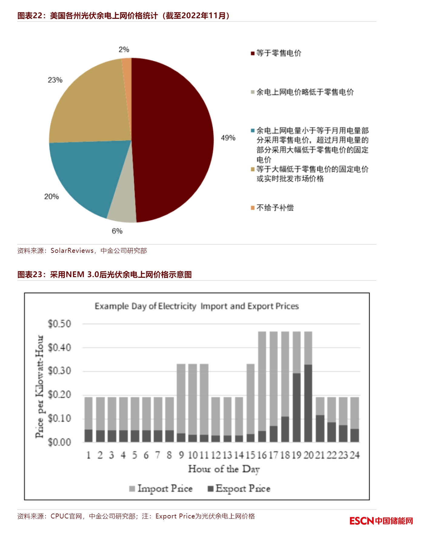 中長期持續(xù)關(guān)注各州補貼政策及能量時移價差。能量時移價差主要由各州零售電價和光伏余電上網(wǎng)電價決定,我們統(tǒng)計美國各州情況,發(fā)現(xiàn)當(dāng)前約75%州的光伏余電上網(wǎng)價格接近零售電價,剩余各州(除夏威夷以外)雖光伏余電上網(wǎng)補償較少,但其零售電價水平較低、拉低能量時移價差,表后儲能經(jīng)濟(jì)性仍較差。但值得注意的是,加州公用事業(yè)委員會于2022年11月10日發(fā)布NEM 3.0提案[3],該提案計劃從凈計量轉(zhuǎn)向凈計費制度、降低光伏余電上網(wǎng)受益,我們認(rèn)為這或?qū)⒃谘a貼退坡后、成為加州表后儲能裝機的又一支撐。
