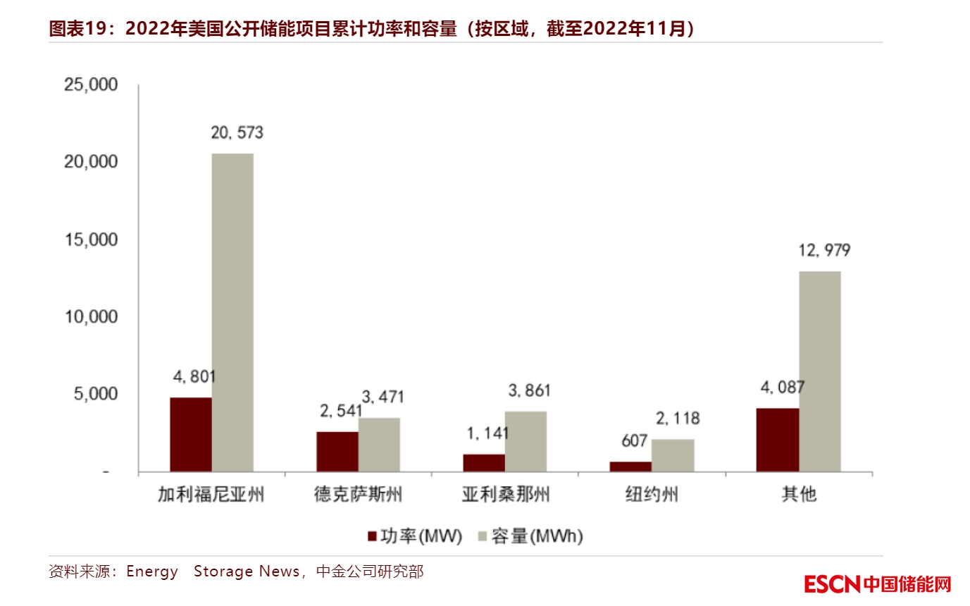美國大儲市場局部放量趨勢明顯。根據(jù)我們統(tǒng)計,2022年以來美國市場公開電化學(xué)儲能項目儲備規(guī)模達(dá)13.2GW/43.0GWh,其中加州占比超過一半,德州風(fēng)電占比較高、需求相對較少;我們認(rèn)為短期看美國加州、德州等局部地區(qū)放量趨勢明顯、儲備項目較多。