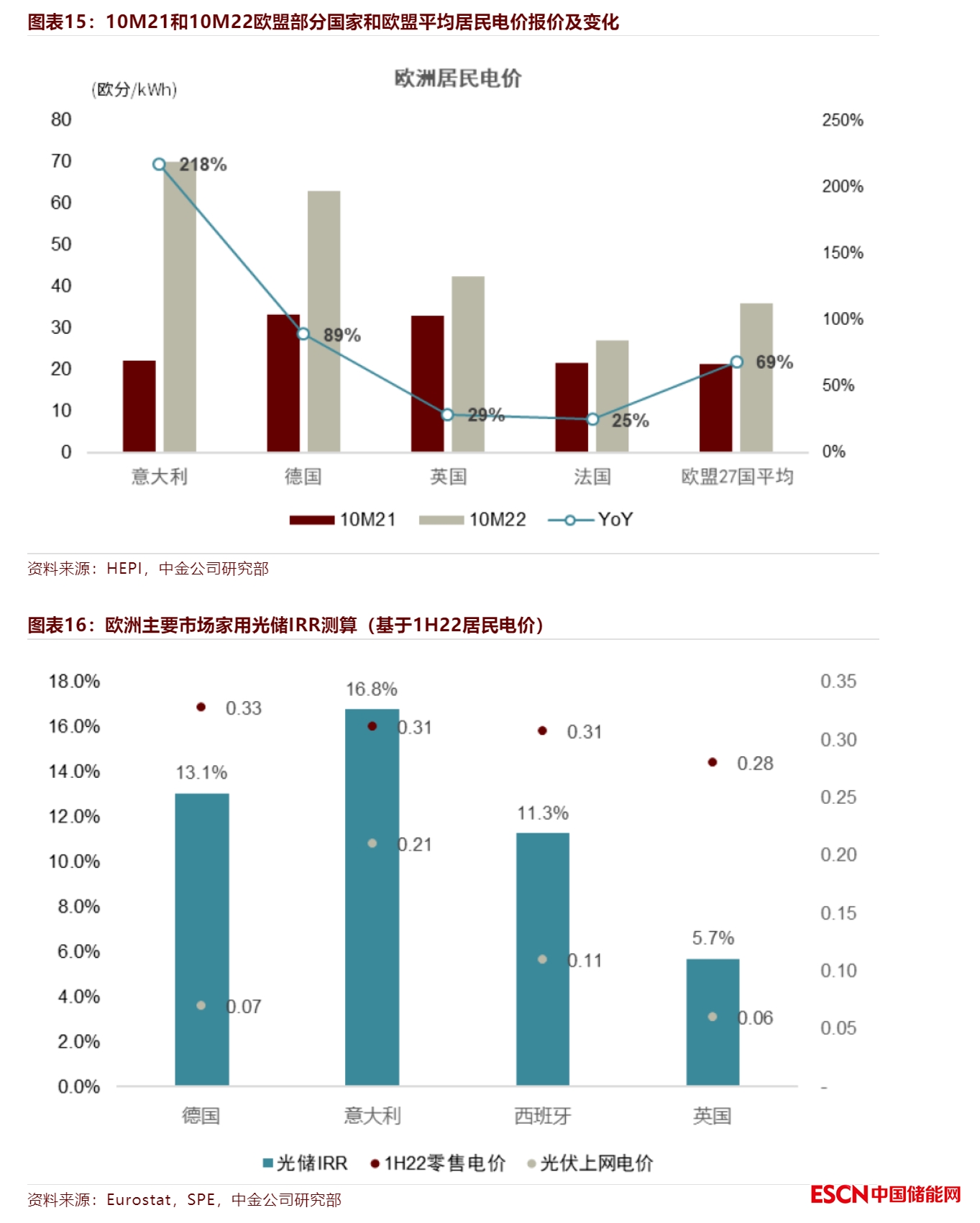 ? 短期:高電價持續(xù)、政策補貼有力,自發(fā)電經(jīng)濟(jì)性可觀、驅(qū)動儲能裝機。歐洲能源危機以來,天然氣價格攀升、拉高批發(fā)市場電價,高批發(fā)電價逐步傳導(dǎo)零售電價。根據(jù)歐盟Eurostat統(tǒng)計1H22各國家庭平均電價,我們考慮各國針對家用光儲的補貼和針對光伏余電上網(wǎng)的價格機制,測算得意大利家用光儲IRR達(dá)16.8%,德國/西班牙分別達(dá)13.1%/11.3%。由于居民電價數(shù)據(jù)靜態(tài)、未考慮后續(xù)天然氣漲價的持續(xù)傳導(dǎo),我們認(rèn)為實際投資經(jīng)濟(jì)性會高于上述測算結(jié)果,短期看考慮政策補貼、家用光伏配儲具備較好的經(jīng)濟(jì)性。