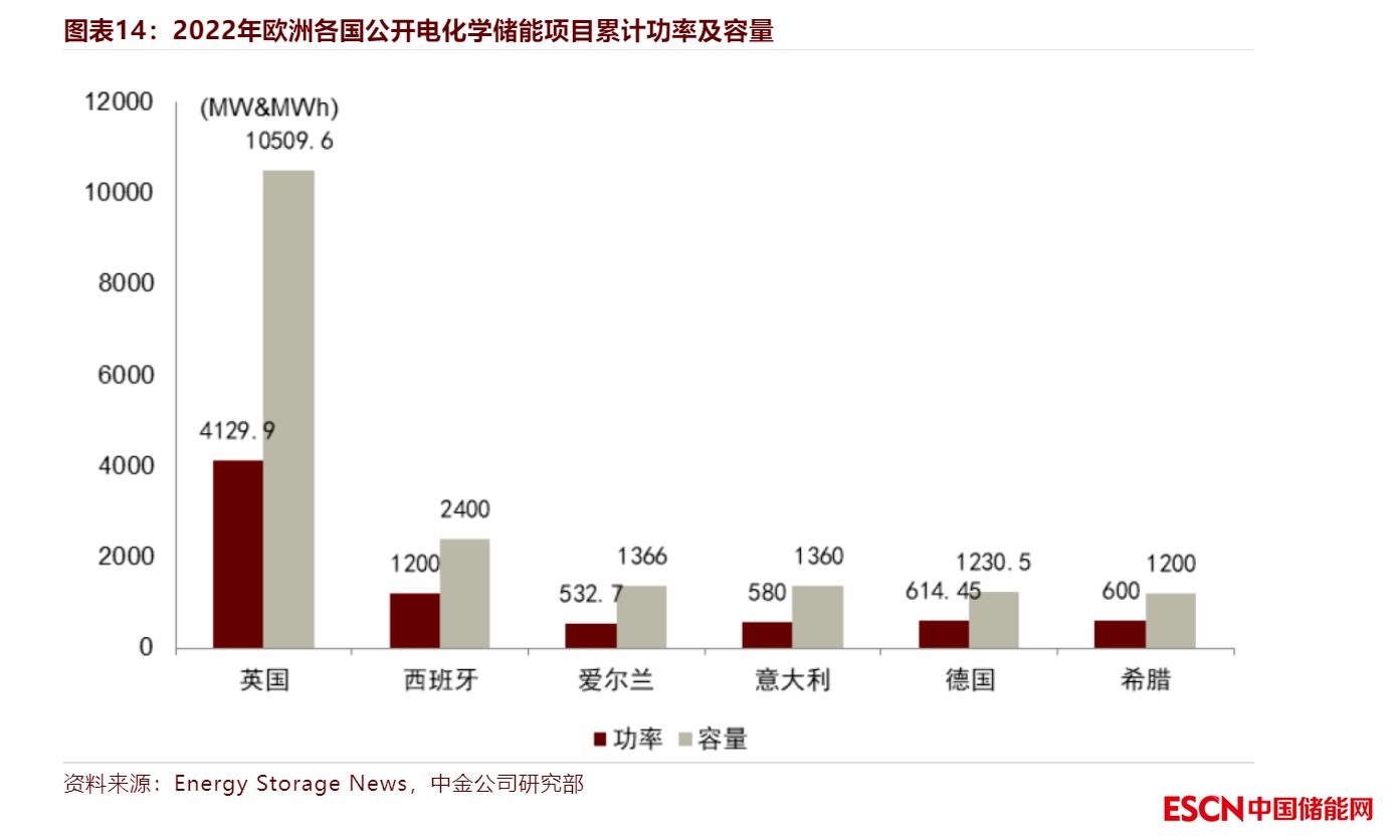 電化學(xué)儲能儲備項目可觀,保障未來2-3年裝機并網(wǎng)。我們統(tǒng)計2022年歐洲各國公開儲能項目,發(fā)現(xiàn)電化學(xué)儲能項目累計規(guī)劃8.6GW/20.3GWh,而抽水蓄能規(guī)劃合計僅為1.07GW。其中,英國規(guī)劃項目規(guī)模最大、達(dá)4.1GW/10.5GWh,西班牙次之、達(dá)1.2GW/2.4GWh,愛爾蘭、意大利、德國和希臘規(guī)劃項目容量均超過1GWh,上述規(guī)劃電化學(xué)儲能項目有望在未來2-3年內(nèi)裝機并網(wǎng)、驅(qū)動歐洲表前大儲裝機增長。