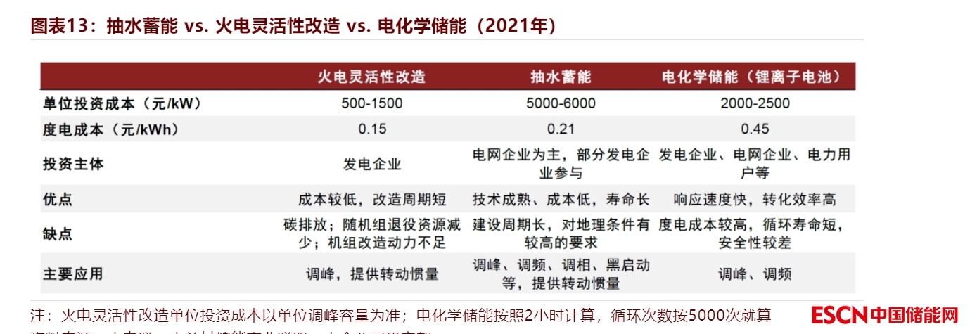 除電化學(xué)儲能等新型儲能外,抽水蓄能及火電靈活性改造亦可成為電網(wǎng)靈活性資源。目前抽水蓄能及火電靈活性調(diào)節(jié)度電成本均低于電化學(xué)儲能,但抽蓄建設(shè)周期長達(dá)6-8年,大規(guī)模貢獻(xiàn)調(diào)節(jié)性資源尚需時日;火電靈活性改造目前成本最低,但面臨改造成本與發(fā)電利用小時數(shù)下降等經(jīng)濟(jì)性制約,政策端需給予合理補償以提升火電廠靈活性改造積極性。