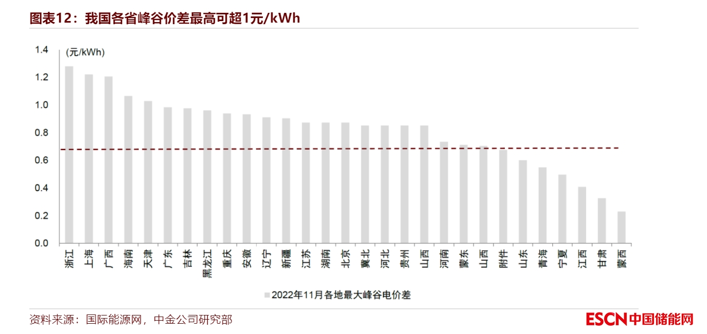 各省政策拉大工商業(yè)峰谷價差,提升工商業(yè)儲能經(jīng)濟(jì)性。2021年以來,廣東、河北、江西等各地方政府均推出政策拉大工商業(yè)峰谷價差,2022年11月,有20余省峰谷價差超0.7元/kWh,浙江、上海、廣西等地峰谷價差已達(dá)1.2元/kWh。
