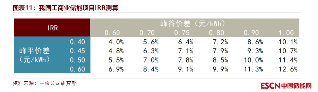 工商業(yè)儲能主要通過峰谷套利實現(xiàn)獲利。我們假設(shè)工商業(yè)儲能電池每天兩充兩放、使用壽命15年,則我們測算在峰谷價差0.8元/kWh、峰平價差0.5元/kWh時,工商業(yè)儲能項目IRR可達(dá)8.5%,具備較好經(jīng)濟(jì)性。