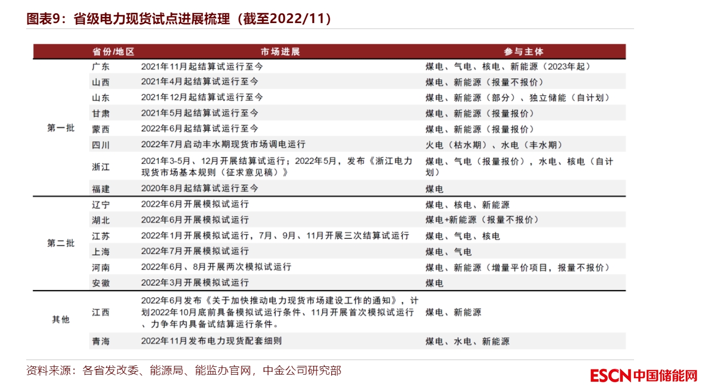 現(xiàn)貨市場基本規(guī)則出臺,電力現(xiàn)貨市場加速推進(jìn)。2022年11月,國家能源局發(fā)布《電力現(xiàn)貨市場基本規(guī)則(征求意見稿)》,對現(xiàn)貨市場組成、與輔助服務(wù)市場銜接、新能源及新興主體參與市場、市場限價、容量補償機制等內(nèi)容進(jìn)行了框架性約定。目前我國已有兩批省份/地區(qū)推進(jìn)電力現(xiàn)貨試點,我們認(rèn)為《基本規(guī)則》為各省電力現(xiàn)貨市場規(guī)則制定了范本,有利于電力現(xiàn)貨市場在全國范圍內(nèi)進(jìn)一步推廣,現(xiàn)貨市場的分時電價機制將有利于儲能獲利模式逐步完善。