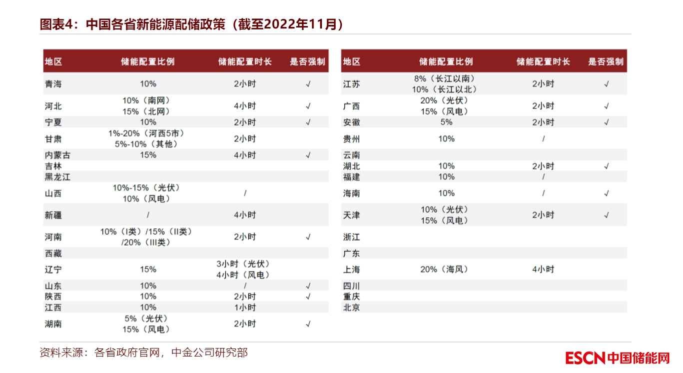 中國在各省新能源強制配儲政策下,風(fēng)光裝機規(guī)模高增直接驅(qū)動表前大儲迎來放量。目前中國已有超20個省份提出新能源配儲要求,風(fēng)光裝機量增長,且配儲比例、配儲時長提升,我們預(yù)期2023年國內(nèi)表前大儲需求量同比增長126%至27.9GWh。表后工商業(yè)儲能則隨各省峰谷價差拉大而有望獲得更高經(jīng)濟(jì)性。