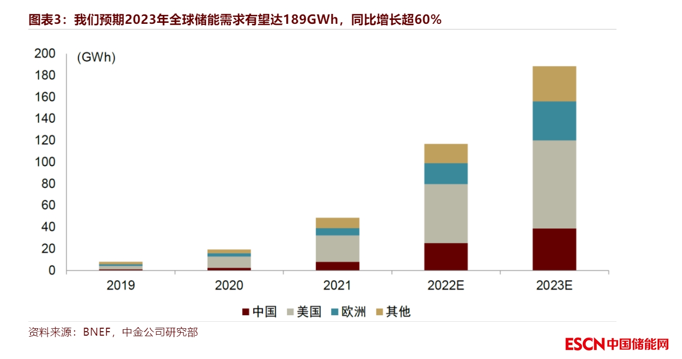 中國儲能網(wǎng)訊:2023年我們預(yù)期中美風(fēng)光裝機高增長驅(qū)動表前配儲需求,歐洲能源危機戶用居民電價維持高位驅(qū)動表后需求、表前大儲項目增長亦有望迎來高增速,我們看好2023年全球儲能鋰電池需求量達(dá)189GWh,同比增長超60%。