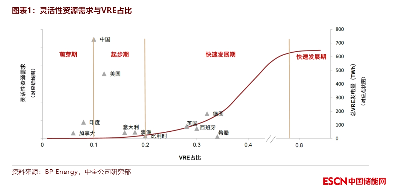 我們認(rèn)為全球儲能發(fā)展的核心驅(qū)動力在于波動性可再生能源發(fā)電量增長增加電力系統(tǒng)不穩(wěn)定性,催生對儲能等靈活性資源的需求。如我們在《儲能,鋰電的第二成長曲線已來臨》報告總中所述,在波動性可再生能源發(fā)展初期,電力系統(tǒng)中可調(diào)火電及抽水蓄能足以應(yīng)對VRE帶來的擾動,VRE發(fā)電量可盡數(shù)并網(wǎng)。隨著VRE裝機量和發(fā)電量逐漸提升至10%-20%的臨界值時,電力系統(tǒng)對儲能等靈活資源的需求將快速增長。從全球范圍內(nèi)看,目前希臘、德國等歐洲國家VRE占比高達(dá)30%+,中國、澳洲、美國市場VRE占比位于10%-20%,我們預(yù)計全球主要國家對靈活性資源需求均將隨可再生能源發(fā)展而迎來快速提升。