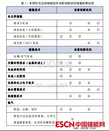 能源相關的技術創(chuàng)新通常需要經(jīng)過五個階段:①概念提出;②技術研發(fā);③一定規(guī)模的工程試驗;④技術示范;⑤部署應用。表1涵蓋了各種儲能技術當前創(chuàng)新階段。隨著脫碳要求變得更為嚴格和對波動性可再生能源發(fā)電的依賴不斷增加,長時儲能技術具有更廣泛的應用前景。例如在波動性可再生能源發(fā)電供應低谷期或由于極端天氣導致異常高水平的電力需求,而此時電網(wǎng)運營商被禁止使用未裝碳捕集裝置的天然氣發(fā)電時,長時儲能技術至關重要。