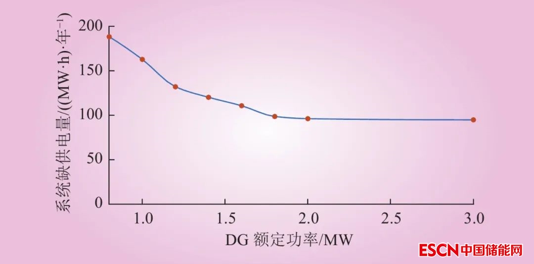 目前,系統(tǒng)中的有源元件主要包括DG和儲能。有源元件的參數(shù)將對系統(tǒng)可靠性產(chǎn)生一定影響。分析DG滲透率對系統(tǒng)可靠性的影響,如圖5所示。在圖5中,紅點為不同DG額定功率下的系統(tǒng)缺供電量,藍(lán)線為三階Hermite插值。由圖5可見,隨著DG功率的增加,系統(tǒng)缺供電量減少。當(dāng)系統(tǒng)發(fā)生故障后,以非故障隔離區(qū)域DG為主要電源形成孤島,減少了負(fù)荷失電。同時隨著DG額定功率增加,系統(tǒng)缺供電量的下降幅度呈現(xiàn)變小趨勢,故當(dāng)DG額定功率達(dá)到一定值時,通過增加DG功率提高可靠性的效果不佳,反而會造成較大的經(jīng)濟負(fù)擔(dān)。