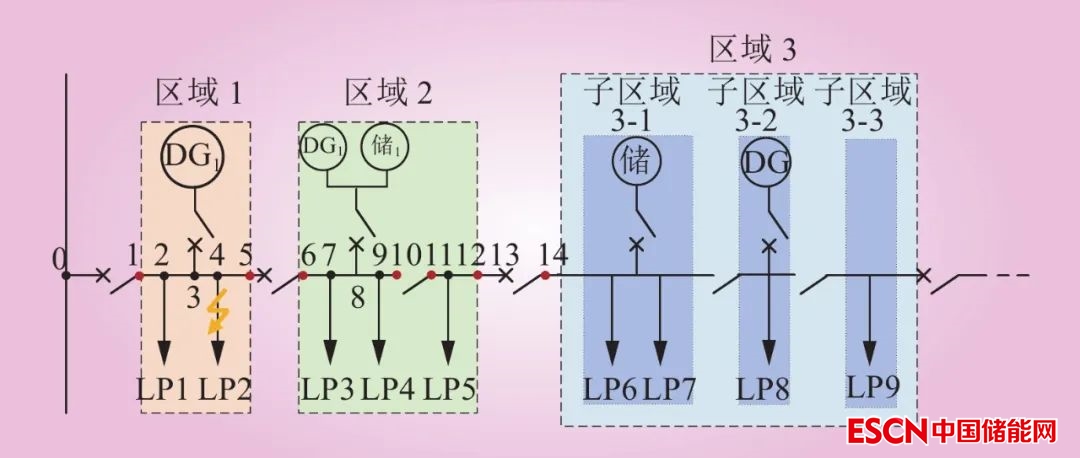 本文采用考慮網(wǎng)絡(luò)重構(gòu)的運行優(yōu)化方法對故障隔離范圍外的系統(tǒng)進行孤島劃分和功率匹配,從而減少失電范圍。在故障隔離過程中,每次拓?fù)涓淖兒缶紤]網(wǎng)絡(luò)重構(gòu)的運行優(yōu)化,即在非故障范圍進行孤島劃分和功率匹配,優(yōu)先保障重要負(fù)荷供電,減少失電影響。饋線分區(qū)示意如圖3所示。為方便表述故障區(qū)域,在圖3中用紅點表示斷路器和隔離開關(guān)兩端增加的節(jié)點,用黑點表示每條支路通過相應(yīng)節(jié)點接入的主饋線。