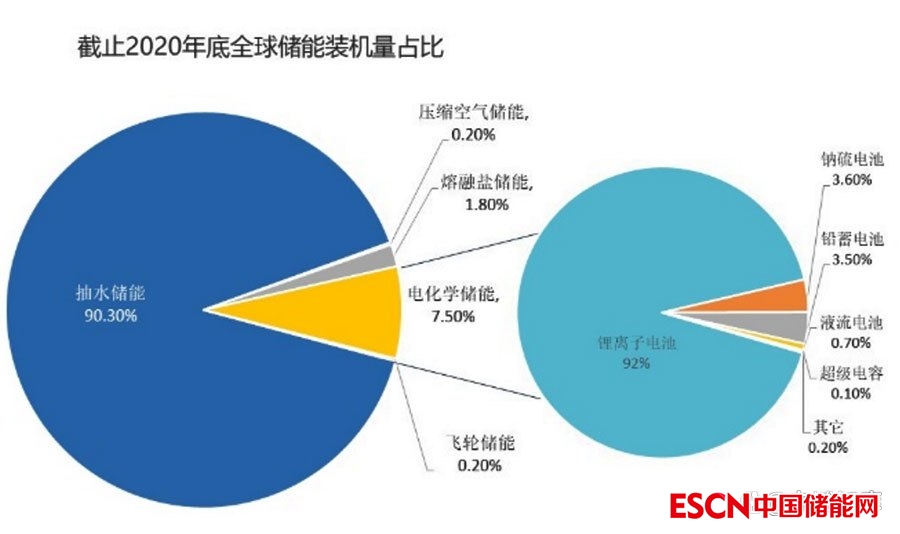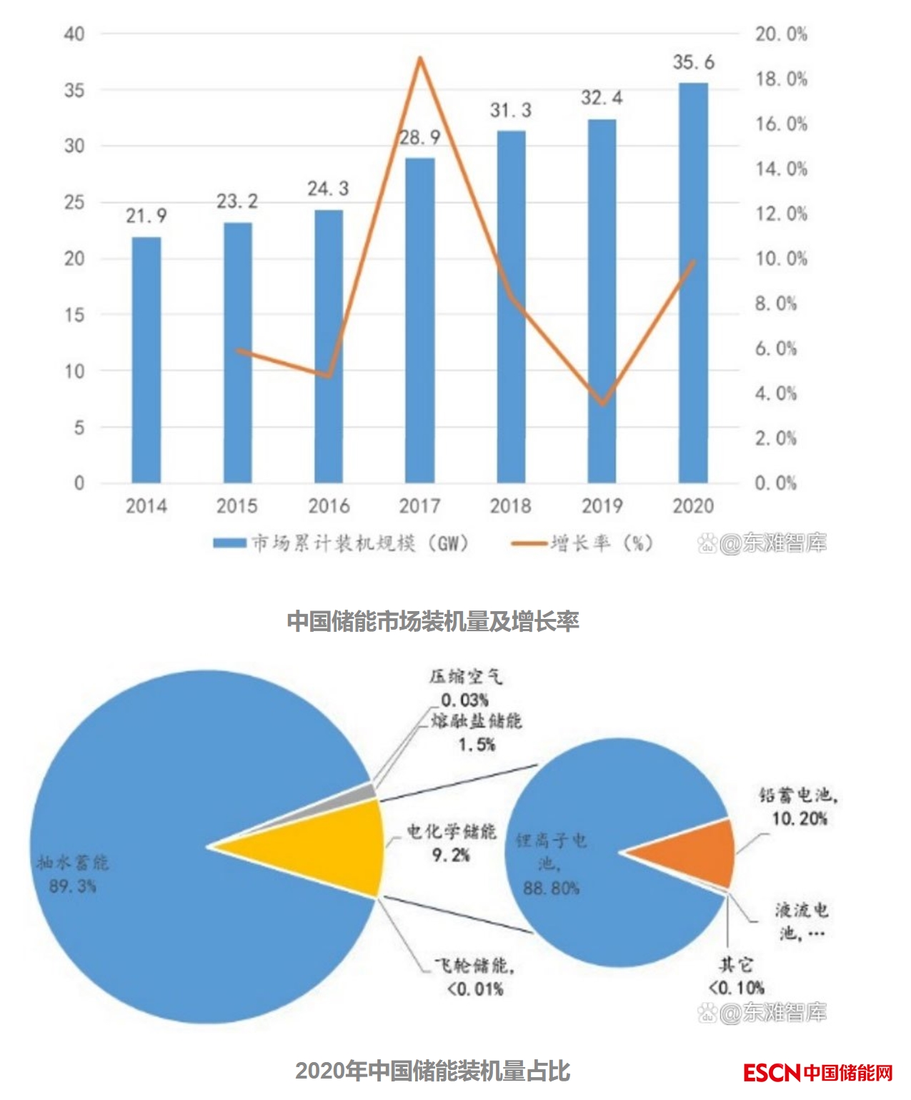 中國儲(chǔ)能市場(chǎng)穩(wěn)步擴(kuò)張,截至2020年底,中國已投運(yùn)儲(chǔ)能項(xiàng)目累計(jì)裝機(jī)規(guī)模為35.6GW,占全球市場(chǎng)總規(guī)模的18.6%,同比增長(zhǎng)9.8%,漲幅比2019年同期增長(zhǎng)6.2%。其中抽水蓄能的累計(jì)裝機(jī)規(guī)模最大,達(dá)到31.79GW,占比達(dá)到了89.3%。電化學(xué)儲(chǔ)能裝機(jī)規(guī)模占比僅為9.2%。