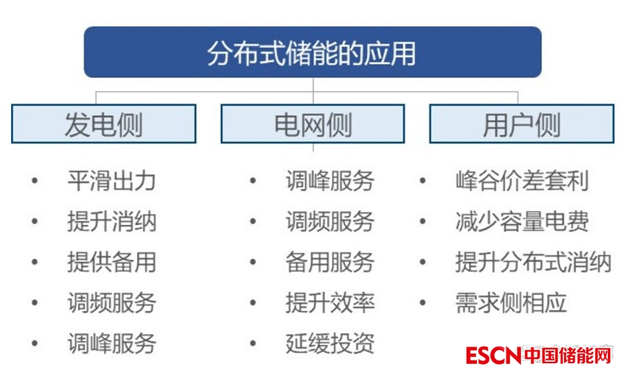 分布式儲(chǔ)能系統(tǒng)因?yàn)榻尤胛恢渺`活,應(yīng)用場(chǎng)景更為廣泛。結(jié)合電力系統(tǒng)構(gòu)成,分布式儲(chǔ)能的應(yīng)用場(chǎng)景主要包括發(fā)電側(cè)、電網(wǎng)側(cè)和用電側(cè),具體分為以下六大類:新能源電站配套儲(chǔ)能、用戶側(cè)儲(chǔ)能、微電網(wǎng)儲(chǔ)能、分布式發(fā)電交易配套、增量配電網(wǎng)儲(chǔ)能和電網(wǎng)側(cè)儲(chǔ)能。