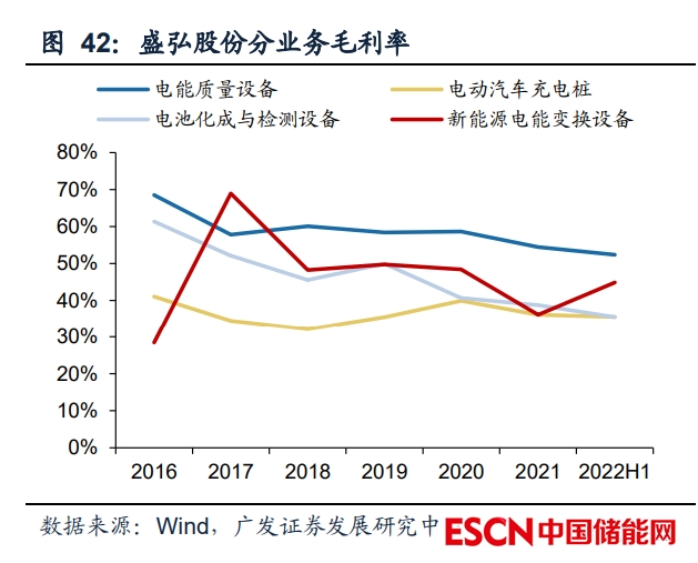 四大業(yè)務(wù)齊驅(qū)業(yè)績(jī)?cè)鲩L(zhǎng),市場(chǎng)需求高漲推動(dòng)儲(chǔ)能釋放彈性。2022H1公司電能質(zhì) 量設(shè)備、電動(dòng)汽車充電樁、化成與檢測(cè)設(shè)備、電能變換設(shè)備營(yíng)收2.09/1.30/1.03/0.81 億元,同比+27.52%/+54.50%/+104.46%/-4.04%,電能變換設(shè)備板塊即逆變器與儲(chǔ) 能集成產(chǎn)品小幅下滑主要系國(guó)內(nèi)大型儲(chǔ)能盈利性下滑、海外受疫情影響導(dǎo)致新能源業(yè) 務(wù) 推 廣 進(jìn) 度 放 緩 所 致 。毛 利 率 方 面 , 四 大 業(yè) 務(wù) 2022H1 毛 利 率 52.38%/35.54%/35.52%/44.90%,同比-2.50pct/-5.73pct/-10.92pct/+6.08 pct,新 能源業(yè)務(wù)通過調(diào)節(jié)產(chǎn)品結(jié)構(gòu)、提高海外營(yíng)收占比帶動(dòng)毛利率提升。