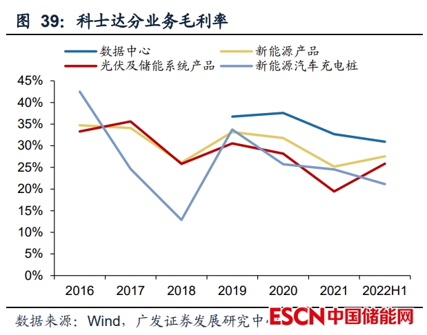 雙輪驅(qū)動(dòng)戰(zhàn)略,數(shù)據(jù)中心業(yè)務(wù)穩(wěn)定發(fā)力,新能源業(yè)務(wù)高速增長(zhǎng)。2019年起公司 對(duì)業(yè)務(wù)進(jìn)行調(diào)整,將UPS、精密空調(diào)等業(yè)務(wù)并入數(shù)據(jù)中心產(chǎn)品,目前主要業(yè)務(wù)包括 數(shù)據(jù)中心產(chǎn)品、新能源產(chǎn)品兩大板塊。2022H1年分業(yè)務(wù)營(yíng)收10.48/4.54億元,同比 +7.29%/134.90%,其中光儲(chǔ)逆變器及系統(tǒng)與電動(dòng)汽車充電樁業(yè)務(wù)增速分別為 160.00%/98.08%,新能源產(chǎn)品充分受益于行業(yè)景氣度高增,業(yè)務(wù)實(shí)現(xiàn)快速增長(zhǎng)。毛 利率方面,2022H1分業(yè)務(wù)板塊毛利率30.93%/27.55%,同比-1.74pct/+2.38pct,其 中光儲(chǔ)逆變器及系統(tǒng)與充電樁毛利率25.85%/21.13%,同比+6.41pct/-3.39pct,光 儲(chǔ)逆變器毛利率提升主要系較原材料成本傳導(dǎo)完成、高毛利率海外市場(chǎng)持續(xù)擴(kuò)張。公司數(shù)據(jù)中心業(yè)務(wù)長(zhǎng)期穩(wěn)定增長(zhǎng),2021年以來(lái)隨著公司新能源業(yè)務(wù)布局初見成效, 新能源業(yè)務(wù)觸底回升,進(jìn)入高速發(fā)展快車道。