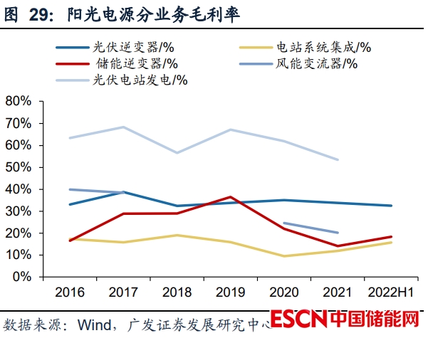 儲(chǔ)能需求旺盛帶動(dòng)營(yíng)收高增。公司業(yè)務(wù)主要包括電站系統(tǒng)集成、光伏逆變器、 儲(chǔ)能逆變器、風(fēng)能變流器與光伏電站發(fā)電五大板塊,2022年H1分業(yè)務(wù)營(yíng)收 59.33/28.77/23.86/4.01/2.89億元,同比+65.21%/6.98%/159.33%/-15.8%/29.05%。儲(chǔ)能逆變器受益于國(guó)內(nèi)與海外儲(chǔ)能需求放量增速?gòu)?qiáng)勁。毛利率方面,2022年H1光伏 逆變器、電站投資開發(fā)與儲(chǔ)能系統(tǒng)三大主要業(yè)務(wù)板塊毛利率32.51%/15.74%/18.37%, 同比-5.64pct/+2.74pct/-2.86pct。逆變器毛利率下滑主要系原材料價(jià)格高漲與疫情影 響下運(yùn)費(fèi)上升影響。預(yù)計(jì)2022年下半年隨著海外與戶用逆變器發(fā)貨量的提升、上游 原材料價(jià)格向需求端傳導(dǎo)會(huì)使逆變器毛利率狀況有所改善。