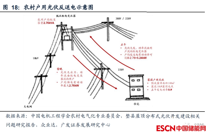 戶用分布式光伏考驗(yàn)配電變壓器容量和線路載流能力,有望帶動(dòng)配電臺(tái)區(qū)儲(chǔ)能 需求放量。根據(jù)《2020 年國(guó)家電網(wǎng)公司年鑒》,2019 年國(guó)家電網(wǎng)公司供區(qū)農(nóng)網(wǎng)戶 均配變?nèi)萘繛?2.76kVA,假設(shè)單戶農(nóng)村屋頂鋪設(shè)光伏 10kW,正午時(shí)分平均出力 8kW, 此時(shí)用電功率最多為 2.76kW,則會(huì)反送電 5.24kW,是戶均供電有功功率(亦為戶 均配變?nèi)萘浚┑?1.9 倍,或超過變壓器容量和線路載流能力限制。解決容量不足問 題存在三種思路:一是替換原有變壓器和線路,進(jìn)行擴(kuò)容。由于“十二五”、“十 三五”我國(guó)大力推進(jìn)農(nóng)網(wǎng)改造,農(nóng)村地區(qū)配網(wǎng)設(shè)備還遠(yuǎn)未達(dá)到使用壽命,因此該方 法經(jīng)濟(jì)代價(jià)較大,較少采用。二是新建變壓器和線路(可以與原低壓供電線路相連, 也可單獨(dú)與分布式電源相連、實(shí)現(xiàn)專線專變并網(wǎng)),分擔(dān)反送電潮流。該方法解決 本電壓等級(jí)容量不足問題,但要關(guān)注上級(jí)變壓器容量是否充足,若不足還需要對(duì)上 級(jí)變壓器進(jìn)行擴(kuò)容,而為應(yīng)對(duì)峰值功率新建變壓器及線路,經(jīng)濟(jì)性難以滿足。三是 配置儲(chǔ)能,降低反送電功率。通過配置儲(chǔ)能既可以使分布式光伏整體出力更加平滑 可調(diào)度,增加本地消納能力,有望成為整縣推進(jìn)新能源消納新思路。