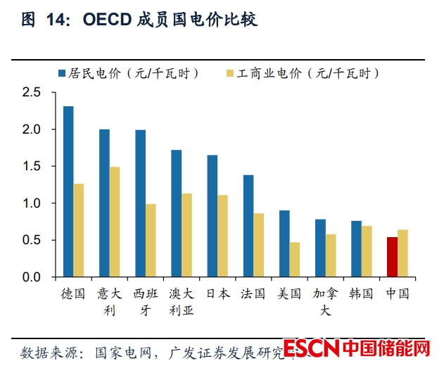 國(guó)內(nèi)居民電價(jià)受到保護(hù),而工商業(yè)峰谷價(jià)差逐步拉大,工商業(yè)儲(chǔ)能有望加快增 長(zhǎng)。相較于歐美高居民電價(jià),國(guó)內(nèi)居民電價(jià)仍保持較低水平,電力供應(yīng)保障相對(duì)充 足,短期內(nèi)仍不具備發(fā)展戶用儲(chǔ)能客觀條件。根據(jù)國(guó)家電網(wǎng)統(tǒng)計(jì),與可獲得數(shù)據(jù)的 全球35個(gè)OECD國(guó)家比較,2019年中國(guó)銷售電價(jià)每千瓦時(shí)約0.62元,約為各國(guó)平均 水平的60%,居民用電價(jià)僅高于墨西哥。而電力市場(chǎng)化改革下工商業(yè)用戶峰谷價(jià)差 擴(kuò)大,目前國(guó)內(nèi)用戶側(cè)配儲(chǔ)主要應(yīng)用于工商業(yè)領(lǐng)域,通過峰谷價(jià)差套利降低整體用 能成本,根據(jù)各省最新的代理購(gòu)電價(jià)格數(shù)據(jù),2022年9月16個(gè)省峰谷價(jià)差擴(kuò)大,21 個(gè)省市最大峰谷價(jià)差超0.7元/Wh,工商業(yè)配儲(chǔ)降低整體用能成本效應(yīng)愈發(fā)顯著。