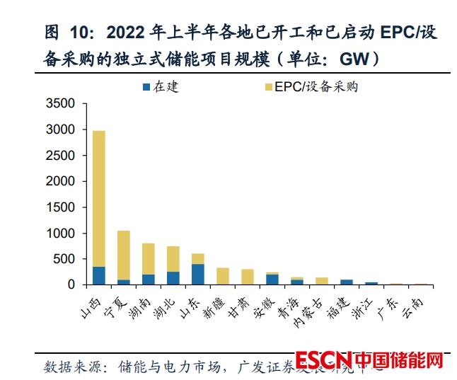 2022年獨(dú)立儲(chǔ)能規(guī)劃與設(shè)計(jì)如火如荼,建設(shè)進(jìn)度逐步提速。根據(jù)儲(chǔ)能與電力市 場(chǎng)公眾號(hào)統(tǒng)計(jì),2022年上半年并網(wǎng)投運(yùn)的獨(dú)立儲(chǔ)能電站2座、啟動(dòng)施工建設(shè)的項(xiàng)目 17個(gè)、進(jìn)入/完成EPC和儲(chǔ)能設(shè)備招標(biāo)的項(xiàng)目64個(gè),總計(jì)規(guī)模9.24GW/18.55GWh, 其中儲(chǔ)能示范項(xiàng)目規(guī)劃較大的山西、寧夏、湖南、湖北等省份推廣進(jìn)度較快。從項(xiàng) 目進(jìn)度來(lái)看,處于規(guī)劃/可研的獨(dú)立儲(chǔ)能電站18.9GW、EPC/設(shè)備采購(gòu)階段5.8GW、 建設(shè)階段1.8GW、投運(yùn)0.1GW,項(xiàng)目總規(guī)模26.6GW/53.6GWh,未來(lái)隨著獨(dú)立儲(chǔ)能 相關(guān)機(jī)制的逐步落地,項(xiàng)目建設(shè)進(jìn)度有望持續(xù)加快。
